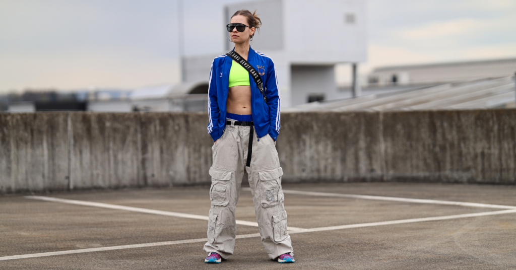 Eine Möglichkeit, mit diesen Tricks eine sportliche Cargohosen-Passform zu kreieren, besteht darin, ein BH-Oberteil (oder einen Sport-BH) mit einer Trainingsjacke und einer übergroßen Cargohose zu kombinieren.